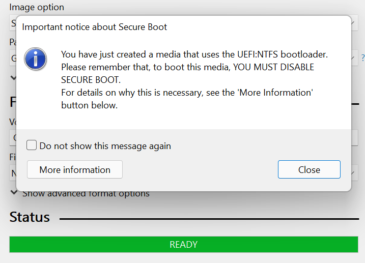 Recibirá un mensaje de éxito cuando se cree la unidad de arranque. Rufus también recomendará deshabilitar el «Arranque seguro» en la configuración de su BIOS antes de usar la unidad de arranque. Continúe con el siguiente paso para aprender cómo se hace.