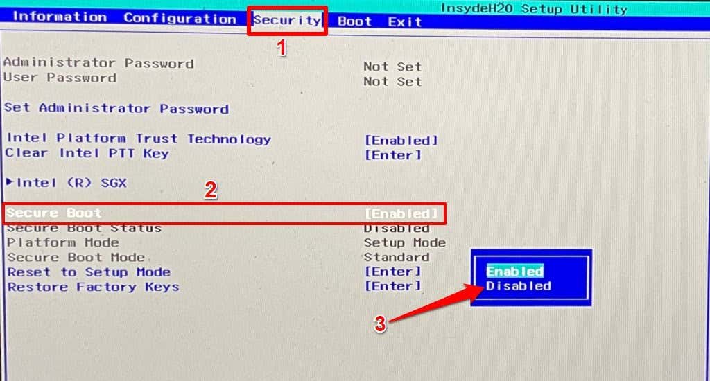 - Mientras está en el BIOS, diríjase a la pestaña Seguridad(Security) , navegue a la fila Arranque seguro y configúrelo en (Secure Boot)Deshabilitado(Disabled) .