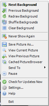 haga clic en z(clic derecho del mouse) Haga clic con el botón derecho en el icono de la bandeja del sistema para acceder más(Más) controles como saltar a la imagen siguiente o anterior informan JBS nunca vuelvas a mostrar una imagen específica, busca actualizaciones JBS o envíale una foto a alguien a través de Gorjeo O correo electrónico.