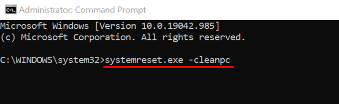 - Pegue systemreset.exe -cleanpc en la terminal y presione Entrar(Enter) .