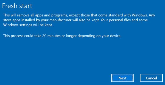 Restablecer su computadora a través de Fresh Start eliminará las aplicaciones instaladas y otros componentes de terceros. Windows también restablecerá algunas configuraciones y preferencias del sistema a los valores predeterminados de fábrica. Sus archivos personales, por otro lado, se dejan intactos.