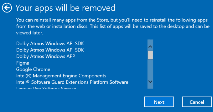 - La herramienta Fresh Start mostrará una lista de aplicaciones que la operación de reinicio desinstalará de su computadora. Vaya a través de las aplicaciones y seleccione Siguiente(Next) para continuar.