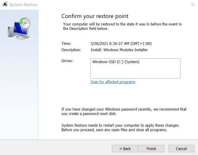 La herramienta Restaurar sistema(System Restore) reiniciará su computadora para aplicar los cambios. Por lo tanto, asegúrese de cerrar todas las aplicaciones y archivos para no perder datos no guardados.