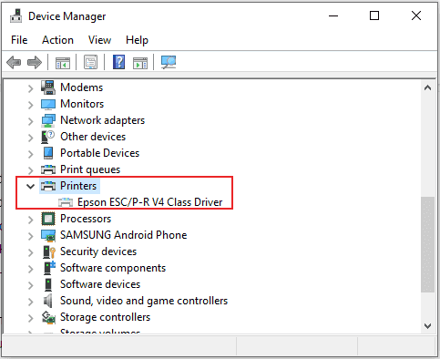 - En el Administrador de dispositivos, busque la categoría Impresoras(Printers) . Si no puede ver su impresora en la lista aquí, haga clic en View > Show hidden devices o busque su dispositivo en Otros dispositivos(Other devices) .