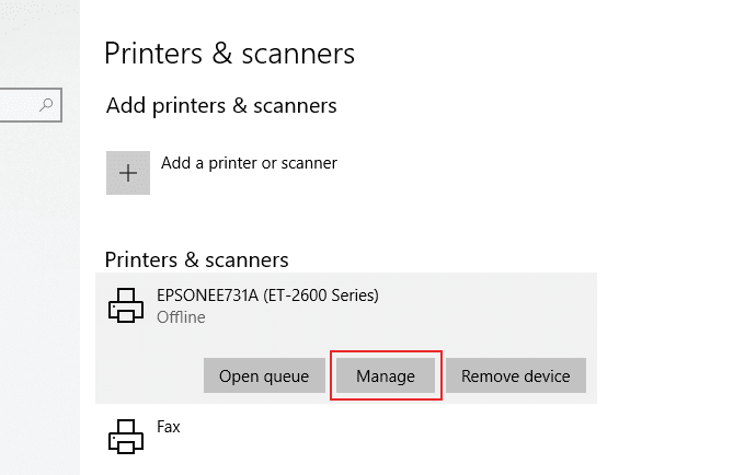 - Una vez que se haya deshabilitado esta configuración, haga clic en su impresora y haga clic en (printer and click) Administrar(Manage) .
