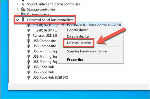 - En la ventana Administrador de dispositivos(Device Manager) , seleccione la flecha junto a la categoría Controladores de bus serie universal(Universal Serial Bus Controllers ) para ver las opciones disponibles. Para cada dispositivo USB enumerado, haga clic con el botón derecho y seleccione Desinstalar (Uninstall) dispositivo(device ) para eliminar los controladores instalados.