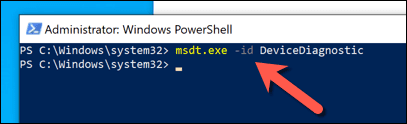 - Escriba msdt.exe -id DeviceDiagnostic y seleccione Entrar(Enter) en la ventana de PowerShell para ejecutar el solucionador de problemas de hardware y dispositivos(Devices) .