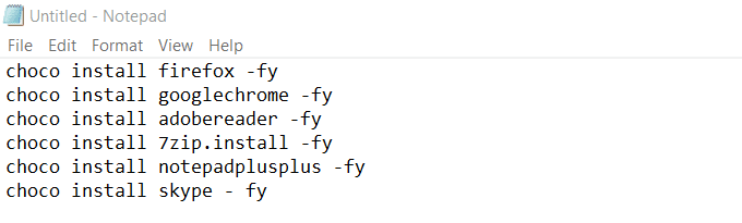 choco install firefox -fy.install install firefox -fy.adobereader -fy.install 7zip.install -fy.install notepadplusplus -fy.install skype – fy