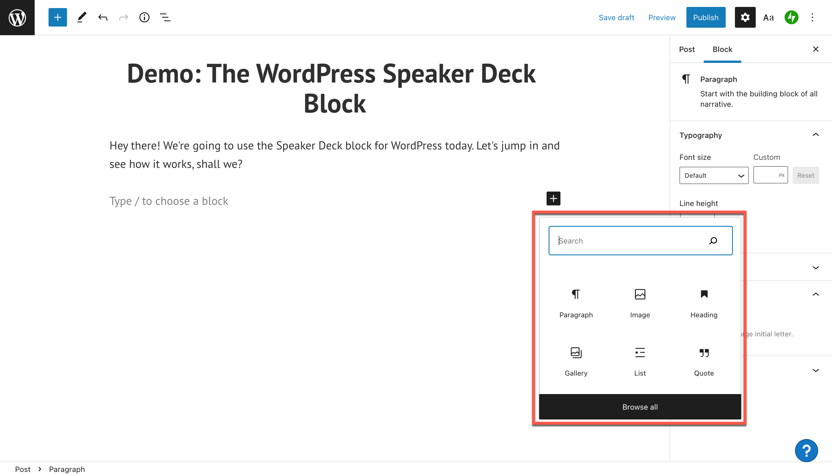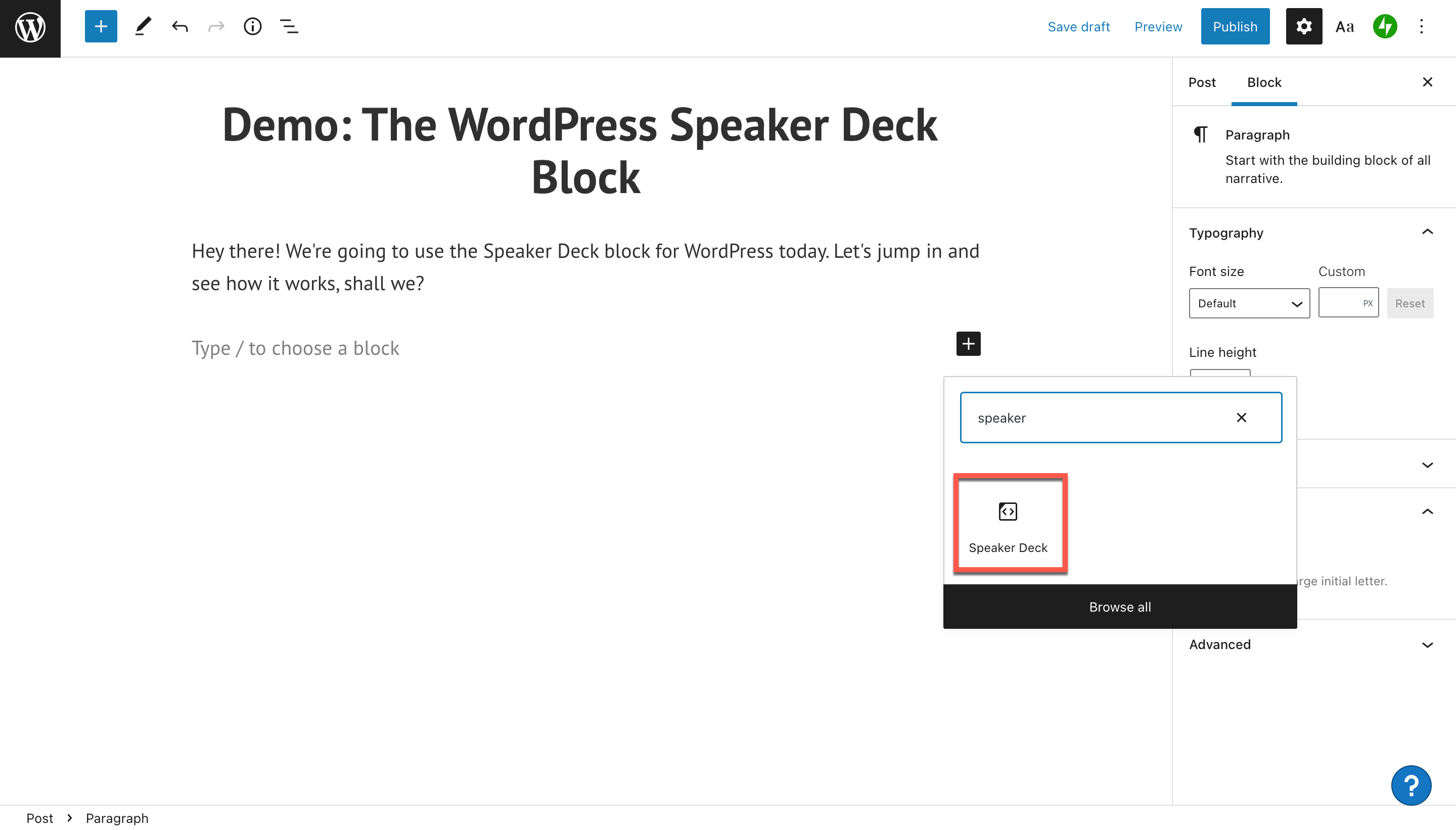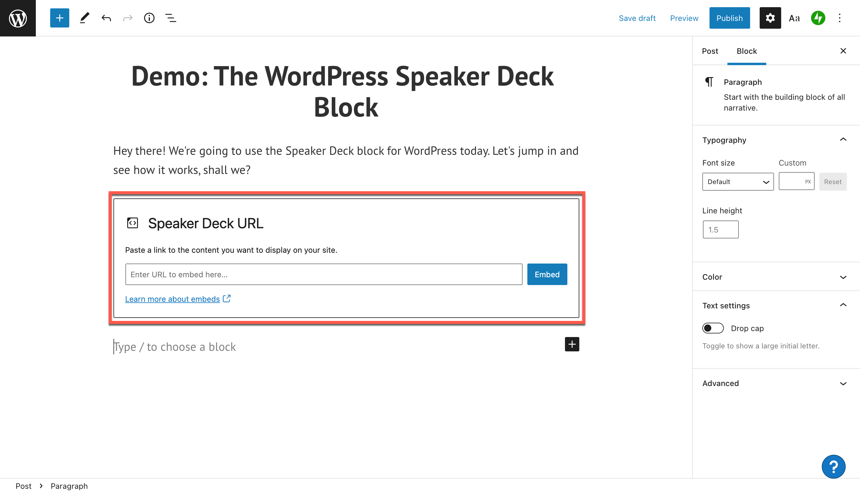 Para empezar con WordPress Plataforma de altavoces bloque incrustado, inicie sesión en su sitio de WordPress y comience un nuevo borrador. Luego siga estos pasos para incrustar la presentación de la plataforma de altavoces.