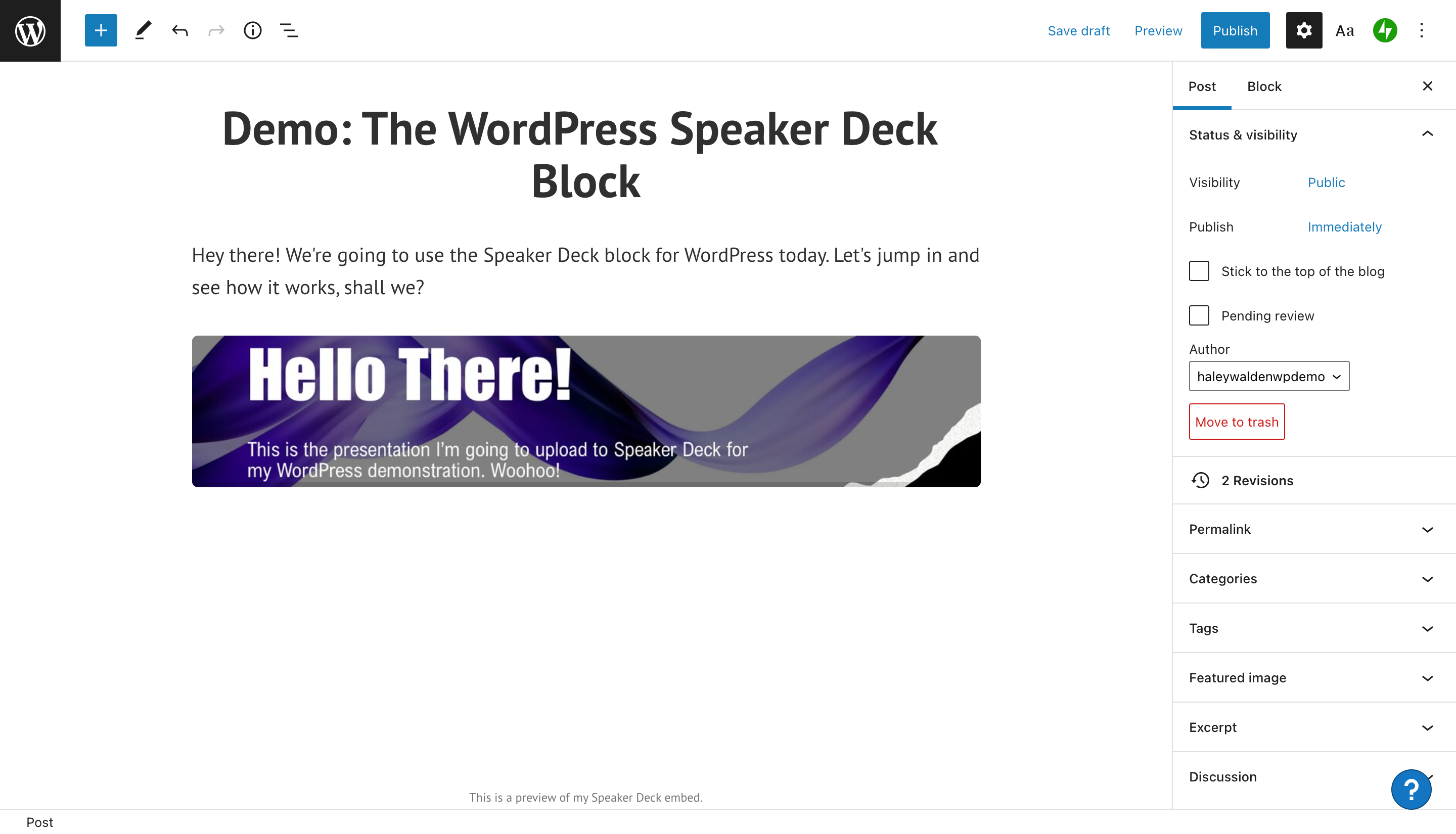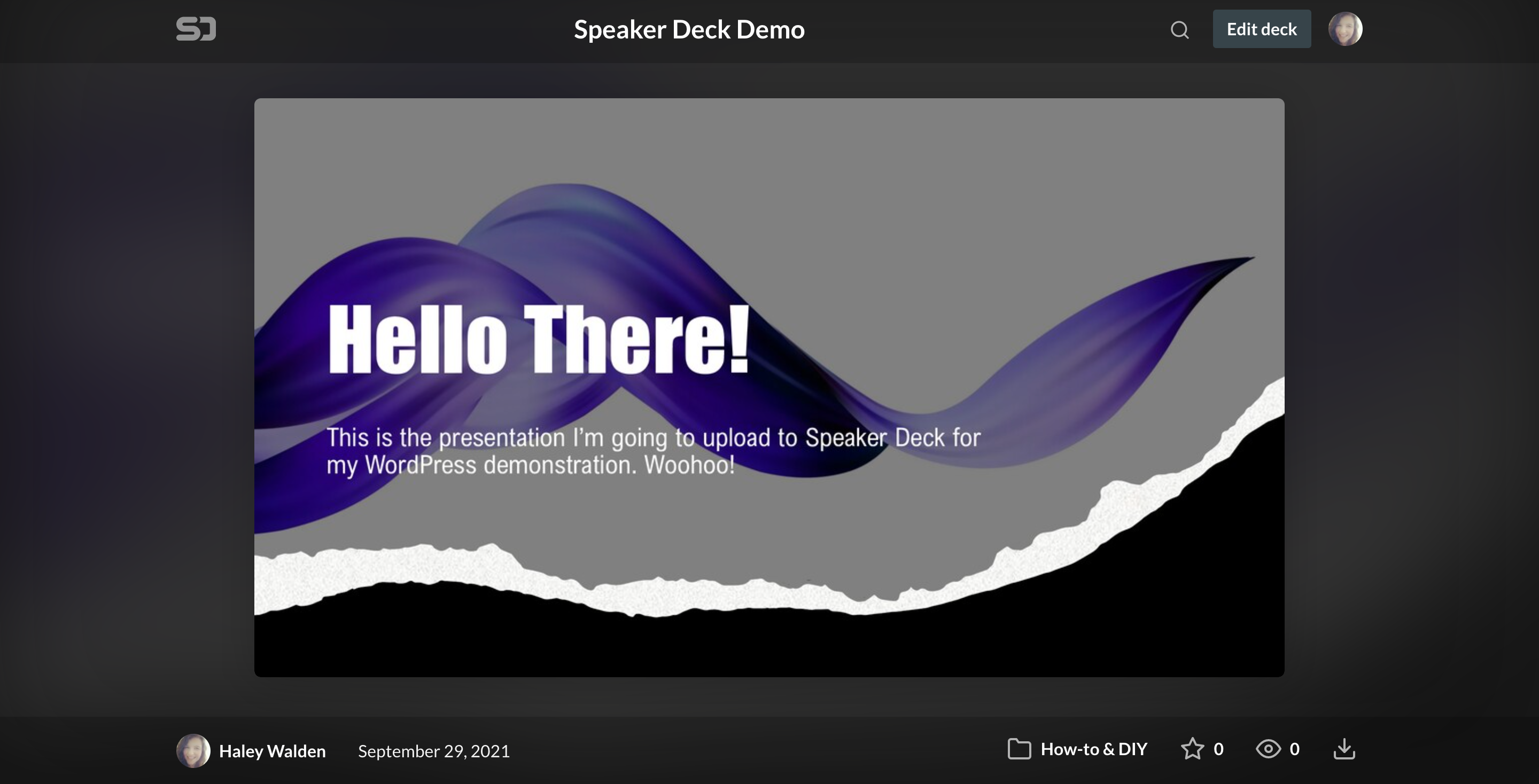Obtener la URL en lugar de la inserción del altavoz significa que algo salió mal con su proceso. Es posible que la presentación no se pueda compartir debido a la configuración del creador original. O tal vez necesite ajustar la configuración en su cuenta de Speaker Deck. Para sentarse correctamente, una plataforma debe configurarse para público. Alternativamente, puede obtener una cuenta de Speaker Deck paga para mantener sus decks privados, pero que aún se pueden compartir con WordPress.