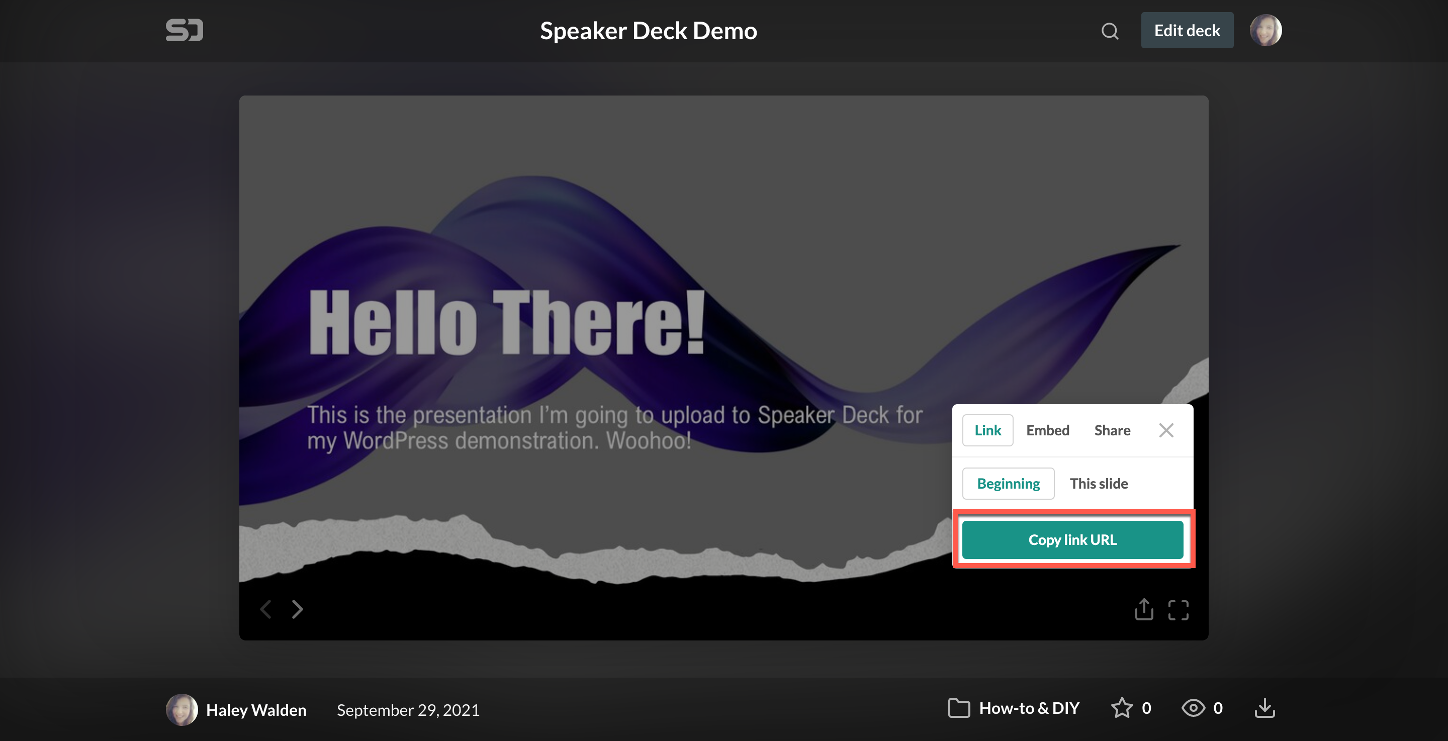 6. Pase el mouse sobre la esquina inferior derecha de la presentación para obtener el botón de compartir. Haga clic aquí y verá varias opciones para incrustar su presentación. Si lo desea, puede elegir una diapositiva específica para comenzar o simplemente comenzar de nuevo. Haga clic en «Copiar URL del enlace» y luego regrese a su cuenta de WordPress.