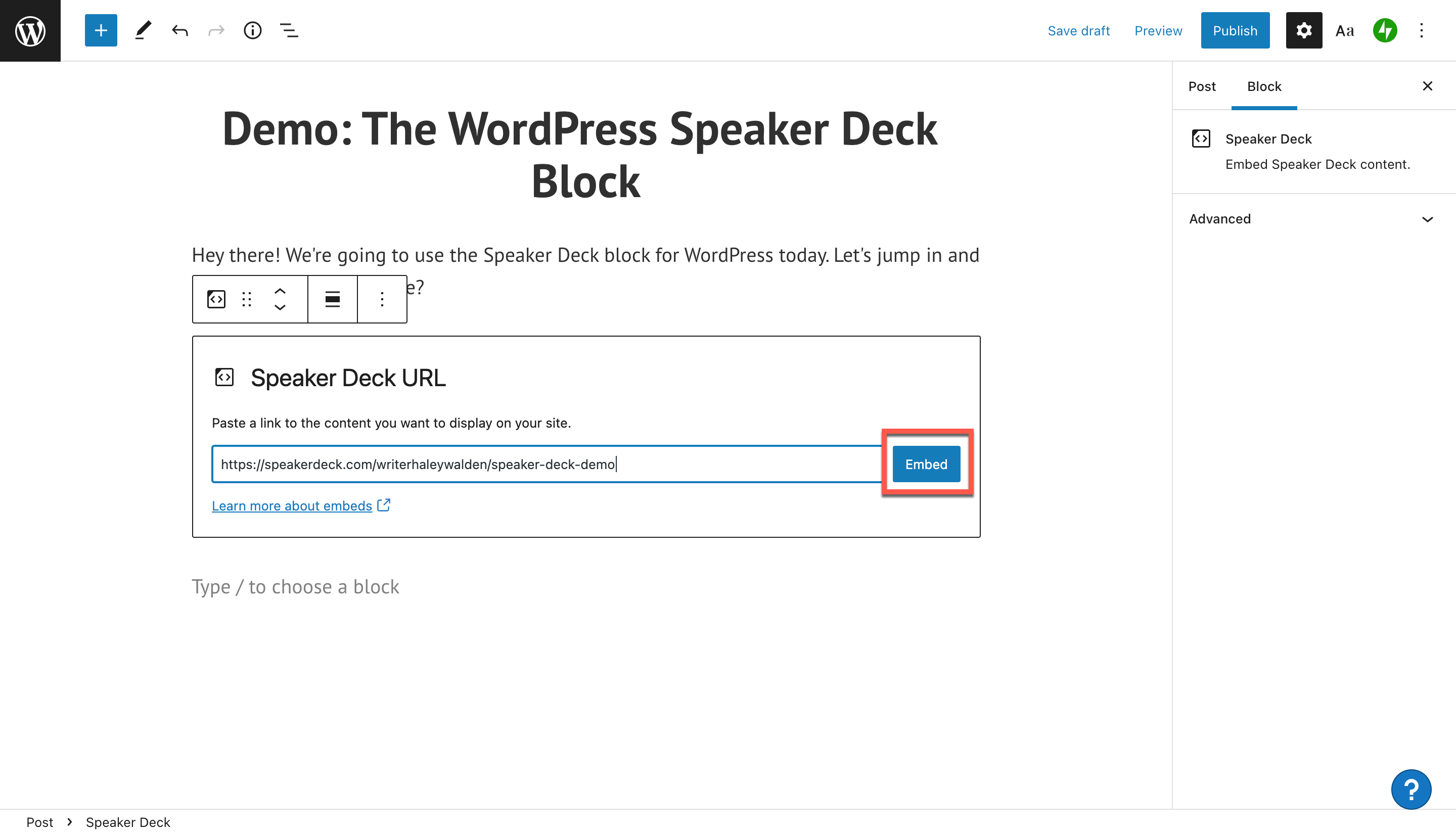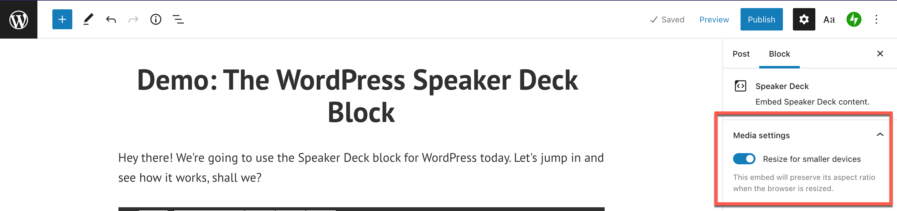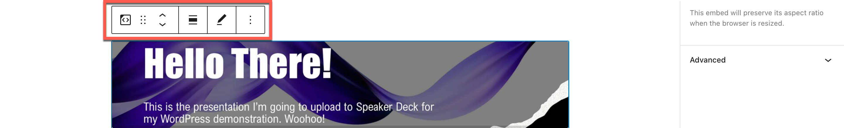 Ahora que ha incrustado la presentación de la plataforma de altavoces, puede realizar ajustes en el bloque para personalizar cómo se muestra. Echemos un vistazo a sus opciones.
