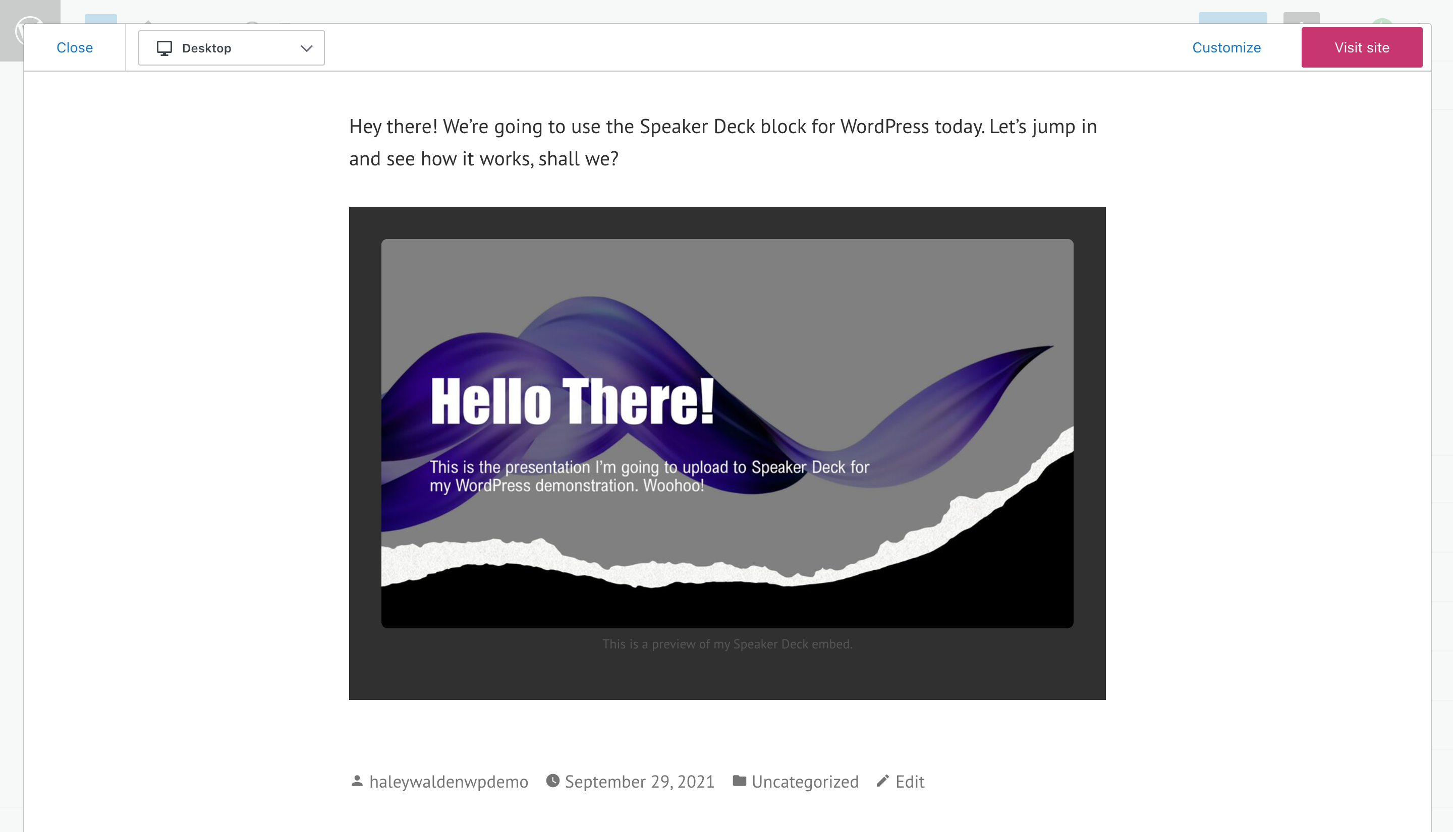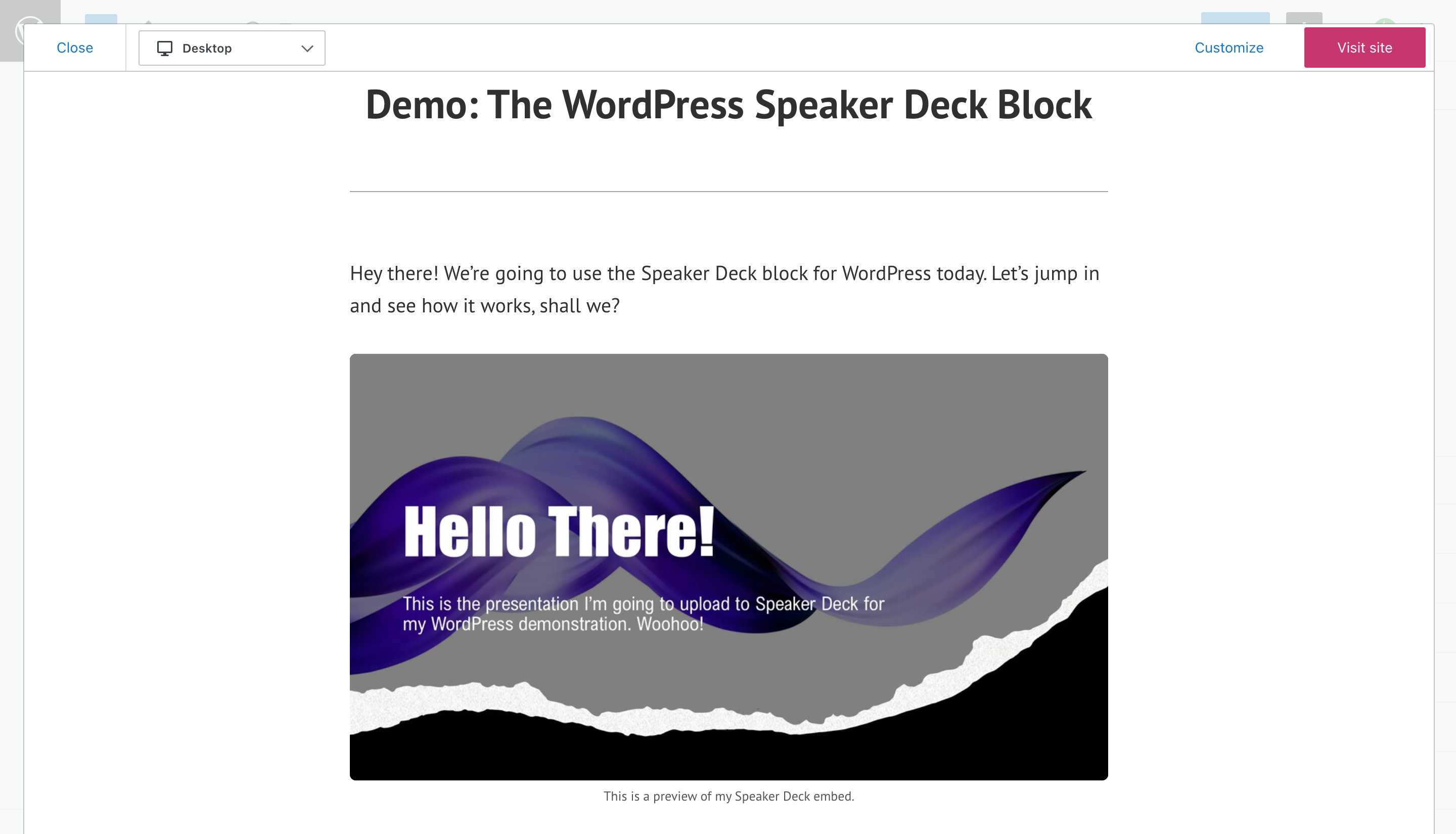8. Ahora verá una vista previa de su bloque incrustado en su editor de WordPress. Si no se puede ver la presentación, volverá al hipervínculo. Alternativamente, puede recibir un mensaje de error.
