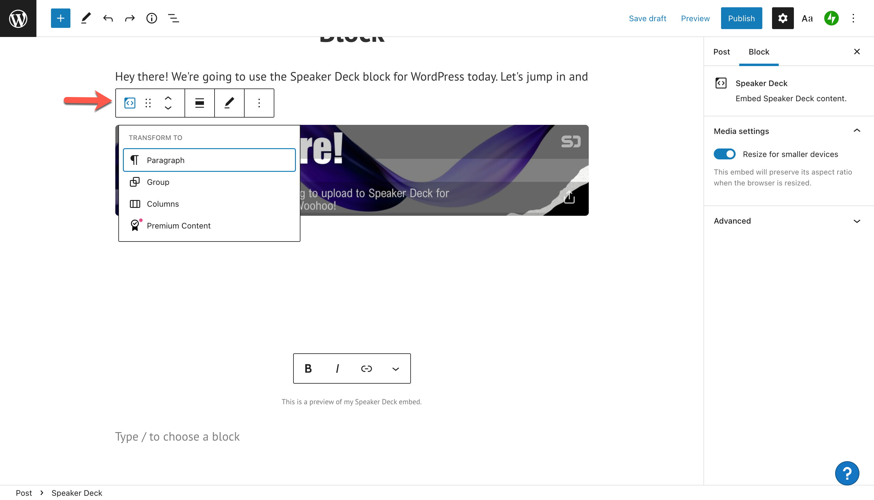 Haga clic en Convertir para cambiar el bloque de altavoces. La configuración de bloque predeterminada es Párrafo, pero también puede convertir el bloque en Contenido Premium (pago, solo para suscriptores), Columnas o un Grupo junto con otros bloques en la página.