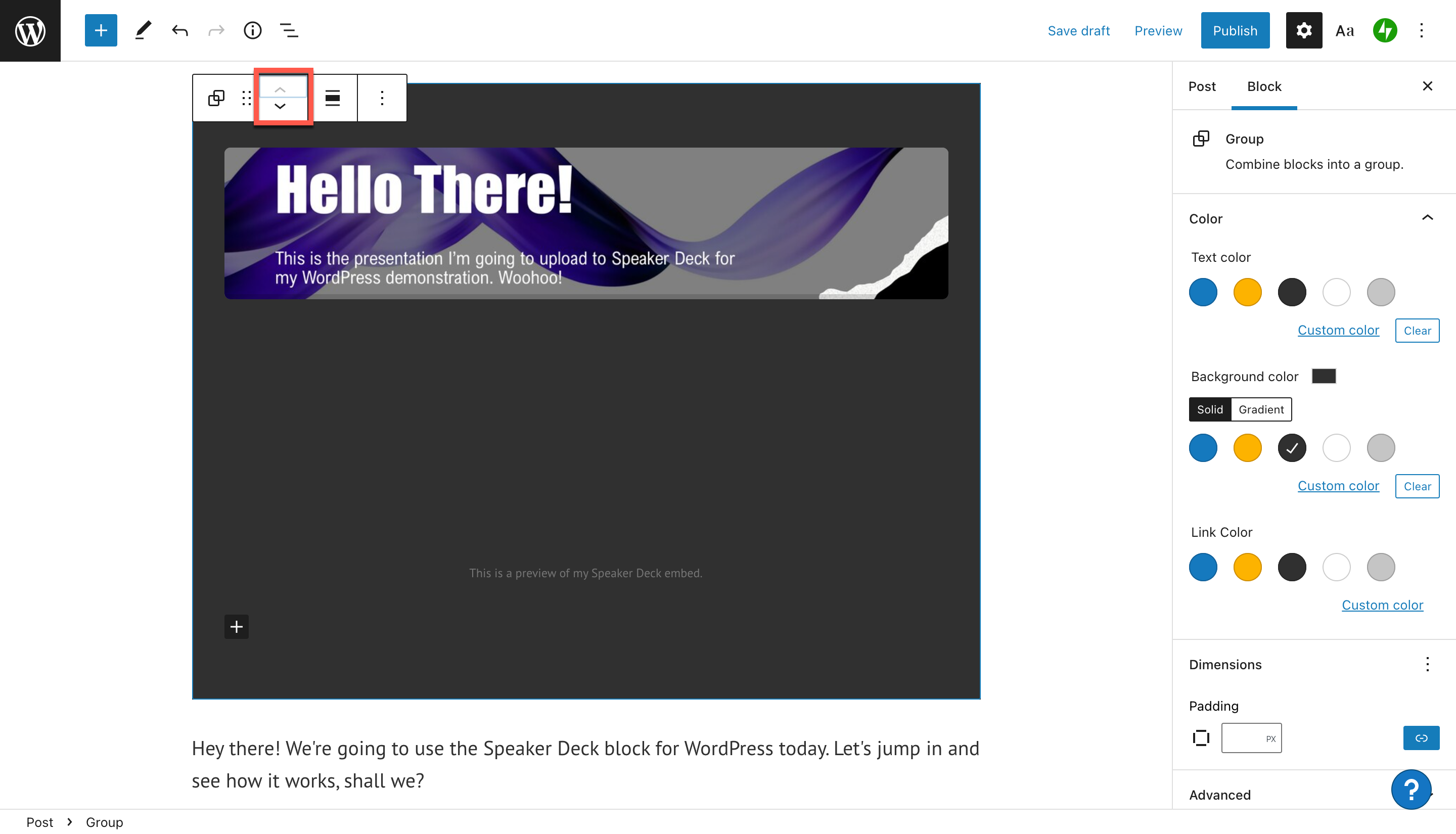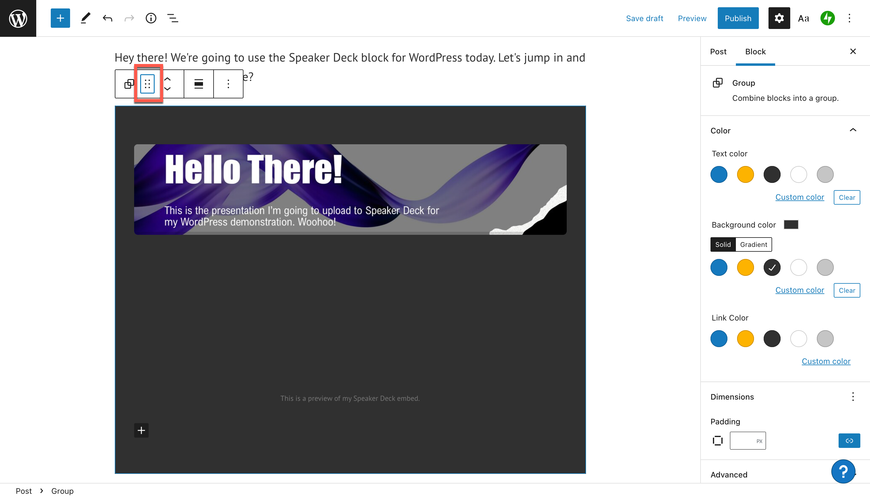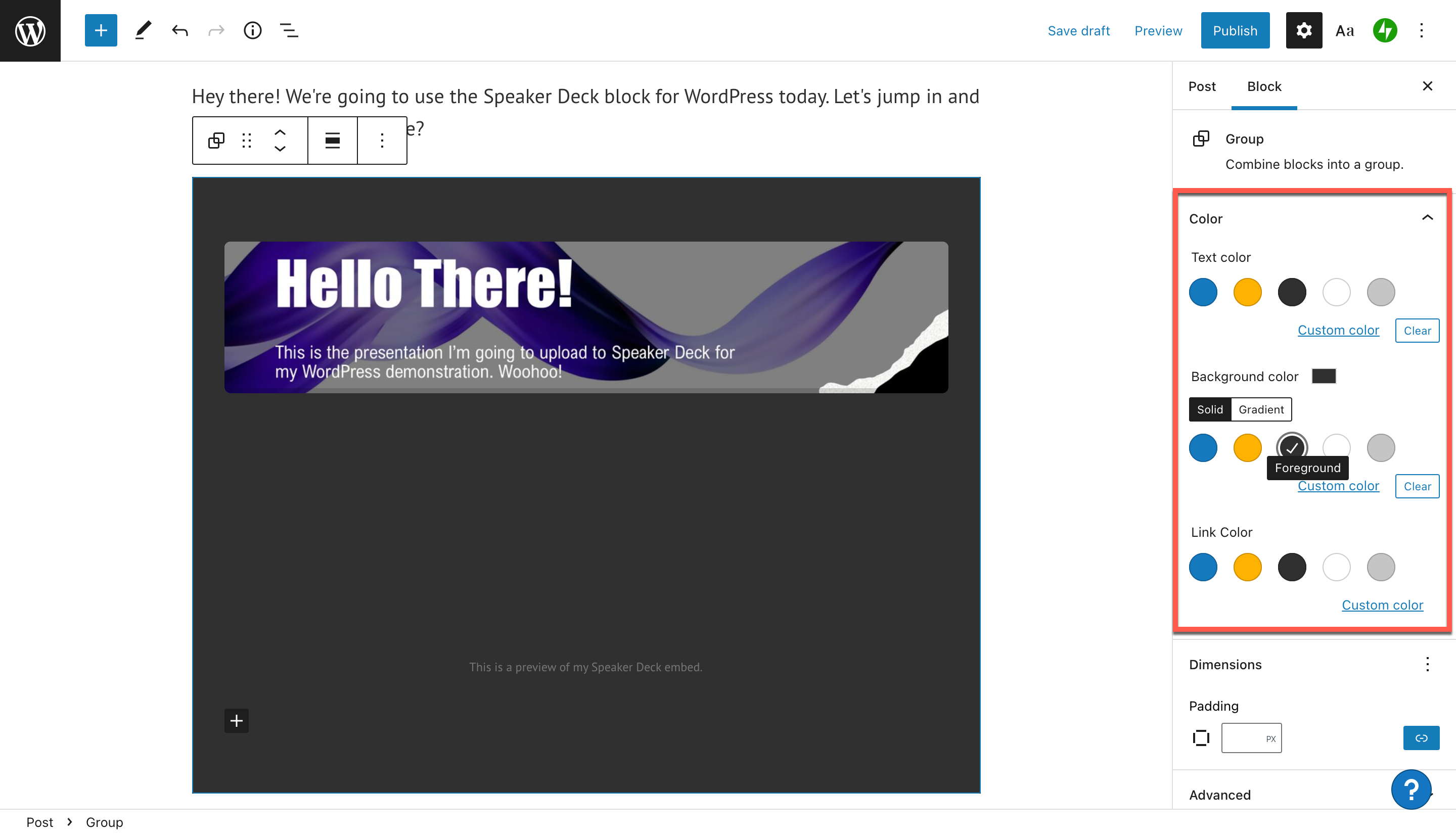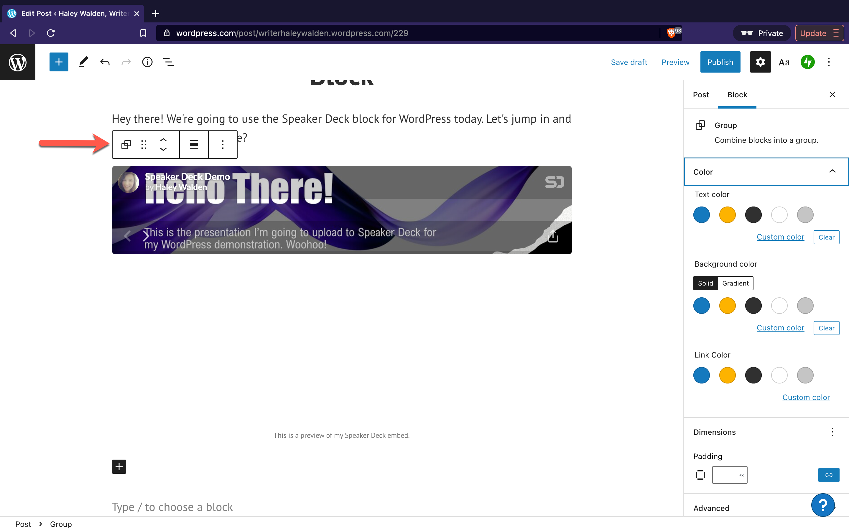 Si elige agrupar su bloque, puede establecer un color de fondo personalizado como marco alrededor de su presentación. Simplemente seleccione Grupo y verá las opciones de color en el lado derecho del editor de WordPress.