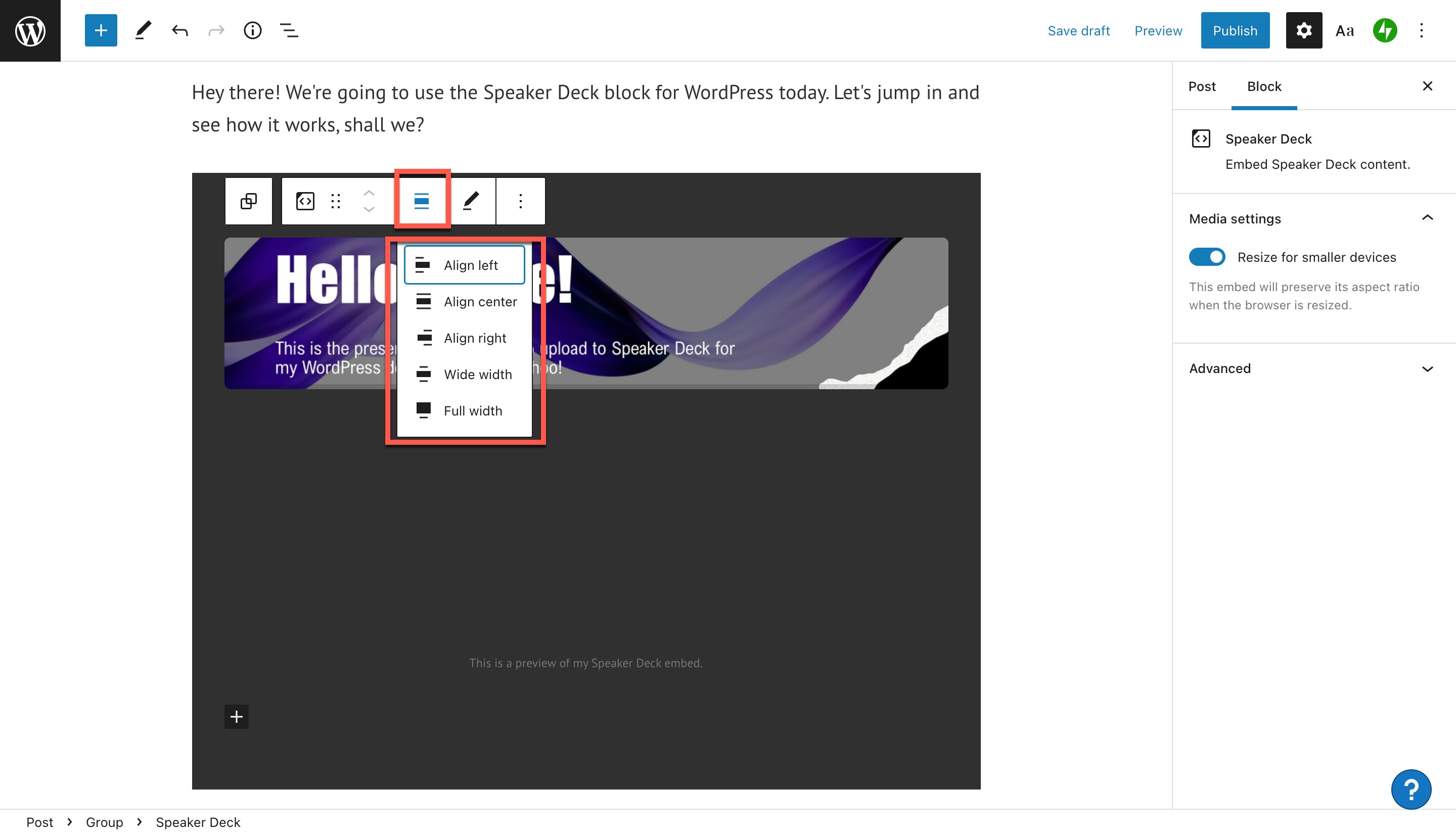 Si desea cambiar la alineación de la presentación en su publicación o página, haga clic en el botón Cambiar alineación. Sus opciones son la alineación izquierda, central o derecha del bloque. Alternativamente, puede optar por mostrar el bloque en ancho completo o ancho.