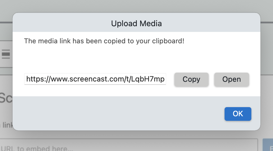 Si está utilizando un Screencast que creó, un Envíe sus medios Aparecerá un cuadro cuando la grabación esté completa y decidas subirla a tu cuenta de Screencast. Tu puedes elegir Copiar para guardar la URL en el portapapeles.