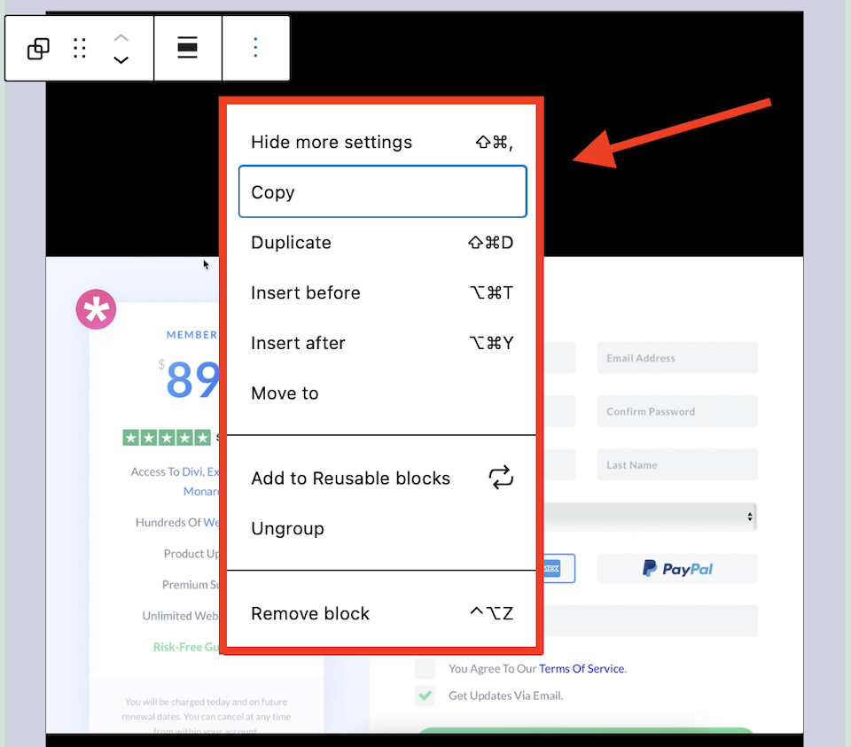 - Copiar: Copie el bloque y luego péguelo en otro lugar de su sitio web o publicación/página.