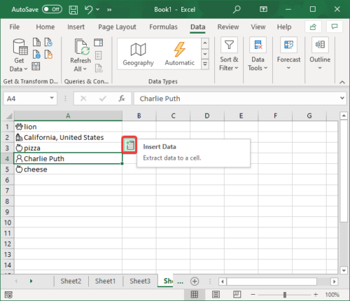 Después de agregar los datos, seleccione todas las celdas, luego vaya a la pestaña Datos . (Datos)En esta pestaña encontrarás la sección tipos de datos(Tipos de datos) donde verá una lista de opciones de tipos de datos que incluyen Geografía(Geografía) Anatomía, Monedas, Animales, Acciones, Plantas, Química,(Geografía, anatomía, monedas, animales, poblaciones, plantas, química) etc. localizar la función automático(automáticamente) en esa lista y haga clic en él.