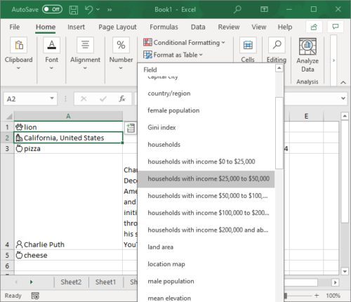 Primero, inserte los tipos de datos a los que desea agregar detalles automáticamente. Pueden ser nombres de animales, ciudades, comida, celebridades, títulos de libros, música, elementos químicos y más.