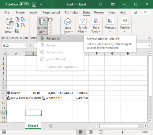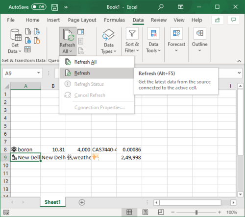 Si desea actualizar los valores del elemento de datos seleccionado, toque el botón desplegable Actualizar todo(Refrescar todo) y luego haga clic en una opción Actualizar.(refrescado)
