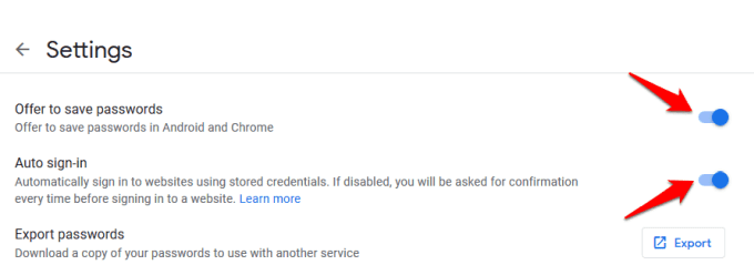 La función Oferta para guardar(Offer to save) contraseñas funciona en Android y Chrome(Android and Chrome) , mientras que la función de inicio de sesión automático inicia sesión(auto sign-in) automáticamente en sitios web utilizando las credenciales almacenadas. Si este último está deshabilitado, recibirá un mensaje de confirmación cada vez que inicie sesión en un sitio web.