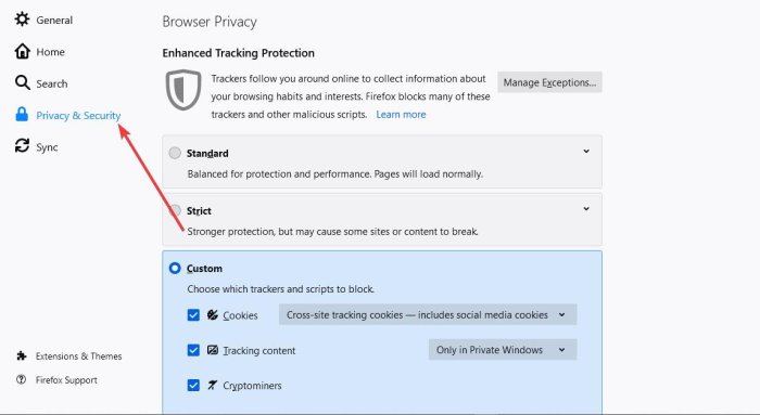 Después de abrir el menú Opciones(Opciones) el siguiente paso es encontrar privacidad y seguridad(Privacidad y seguridad) . No es difícil de encontrar porque está dos pasos debajo de la pestaña. Comienzo . (Casa)A partir de ahí querrás elegir Tarjetas de crédito almacenadas(Tarjetas de crédito guardadas) en Formularios y autocompletar(Formularios y Autocompletar) . tener(llevar) Tenga en cuenta que esta sección solo se mostrará si tiene datos de tarjeta de crédito guardados.
