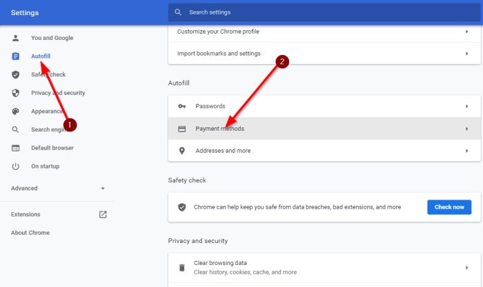 - Después de abrir el menú Configuración, haga clic en (Ajustes)Autocompletar> Métodos de pago .