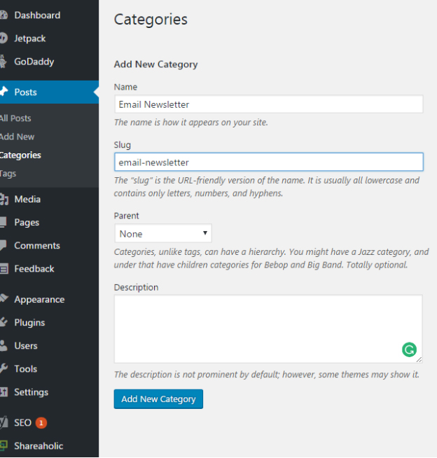 Vaya al panel de administración, luego vaya a Publicaciones en el menú de la izquierda y haga clic en Categorías. Agregue una nueva categoría bajo el encabezado Agregar nueva categoría. Puede nombrarlo como un boletín de correo electrónico.