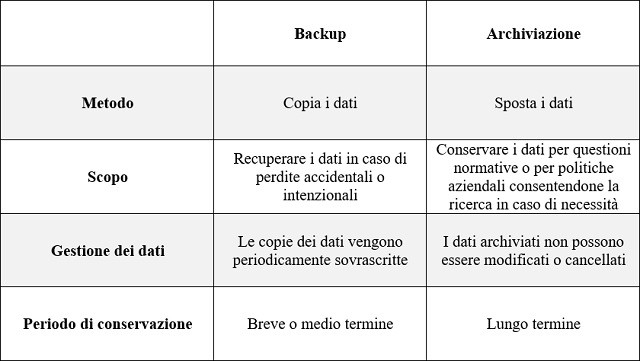 El archivo de datos se lleva a cabo principalmente debido a las normas o políticas de la empresa, lo que permite buscar los datos archivados si es necesario. Por ejemplo, un correo electrónico certificado, conocido más formalmente como PEC, debe archivarse y almacenarse legalmente durante al menos 10 años.