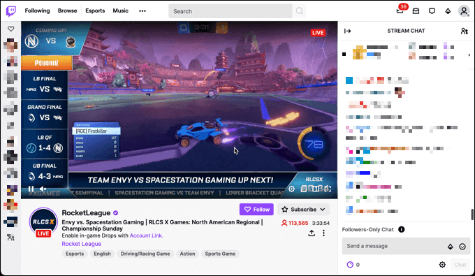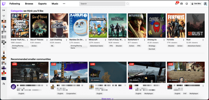 En Twitch , la interfaz es fácil de navegar, con recomendaciones al frente y al centro en la página principal. Si está suscrito a algún canal de Twitch , puede acceder rápidamente a ellos a través de los íconos a la derecha. Cuando estés viendo una transmisión, verás controles básicos en la parte inferior del video, con un chat plegable a la derecha.