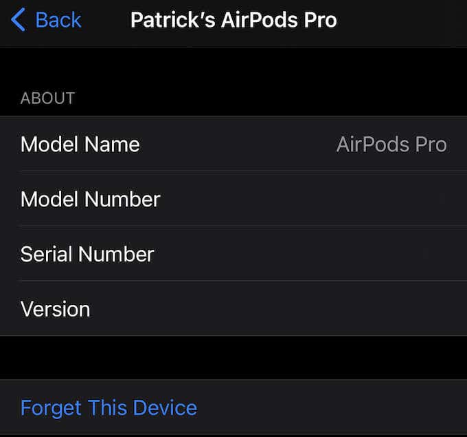 Następnym rozwiązaniem jest powtórzenie procesu parowania z AirPods(powtarzanie procesu parowania z AirPods) . Aby to zrobić, otwórz Ustawienie(Ustawienia) > Bluetooth i dotknij symbolu „i” po prawej stronie AirPods. Następnie dotknij zapomnij o tym urządzeniu(Zapomnij to urządzenie) a potem dotknij zapomnij urządzenie(Zapomnij urządzenie) aby zakończyć proces.