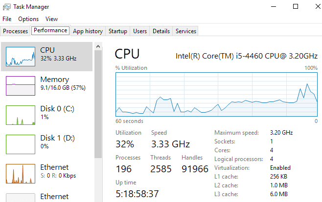 Sin embargo, en ventanas 10 realmente no necesita cambiar el gráfico, ya que muestra cuánto enchufes(Enchufes) , núcleos(núcleos) Sí procesadores lógicos(Procesadores lógicos) está en el sistema. En mi caso, tengo un enchufe, lo que significa que tengo uno Procesadores físico. Tengo 4 núcleos, lo que significa que es un procesador de cuatro núcleos. Así que tengo un total de 4 procesadores lógicos.