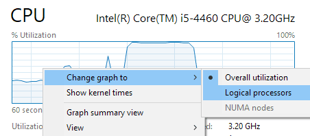 De forma predeterminada, muestra un único gráfico, pero puede cambiarlo haciendo clic con el botón derecho en el gráfico y seleccionando cambiar el gráfico a(Cambiar el gráfico a) y luego seleccionando Procesadores lógicos(Procesadores lógicos) .