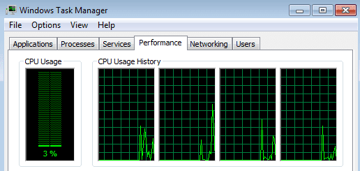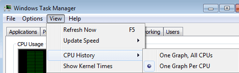 En ventanas 7 el administrador de tareas se ve un poco diferente. Primero, debe cambiar la vista para mostrar un gráfico en Procesadores . Esta es la única forma de saber cuántos núcleos tiene una máquina. Procesadores en ventanas 7 utilizando el administrador de tareas.
