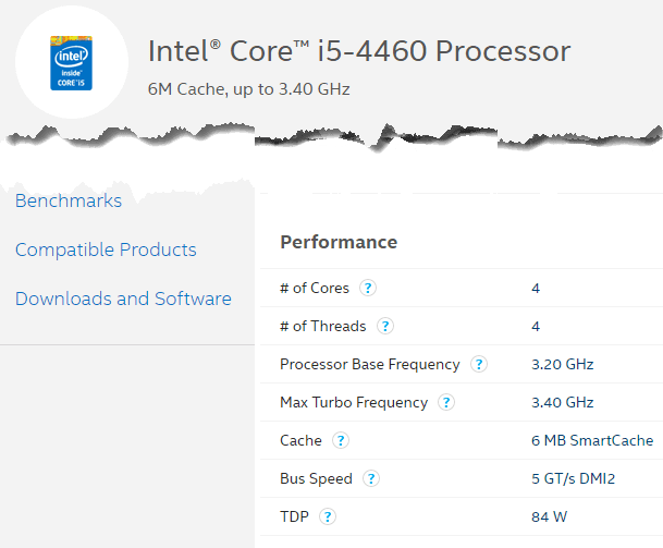Una vez que tenga el modelo exacto Procesadores desde la información del sistema, también puede buscarla en Google y obtendrá una hoja de especificaciones en línea para esa CPU (busqué en Google el núcleo i5-4660).