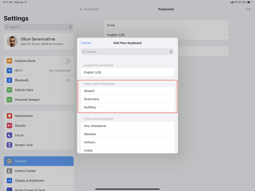 Si instala un teclado en pantalla de terceros (como Gboard, SwiftKey o Grammarly(Gboard, SwiftKey, or Grammarly) ) en su iPad, no aparecerá en su lista de teclados a menos que lo active.