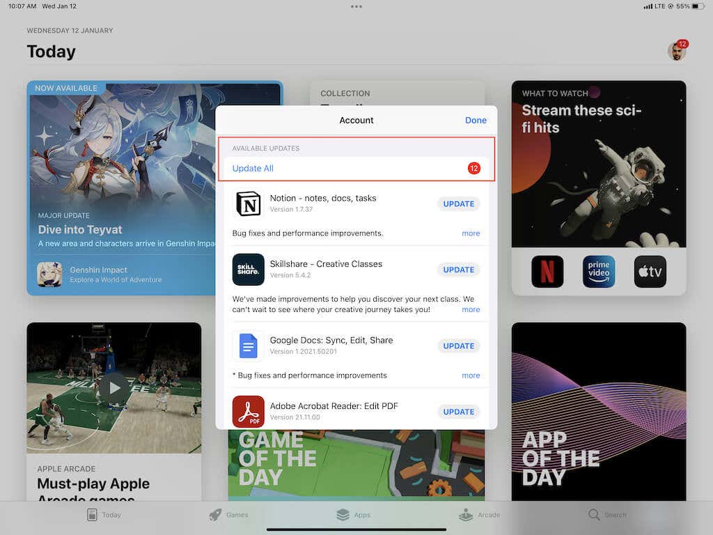 Si los problemas del teclado en pantalla persisten, intente actualizar las aplicaciones en su iPad. Para hacerlo, mantenga presionado el ícono de App Store en la (App Store)pantalla(Home Screen) de inicio y seleccione Actualizaciones(Updates) . Luego, toca Actualizar todo(Update All) .