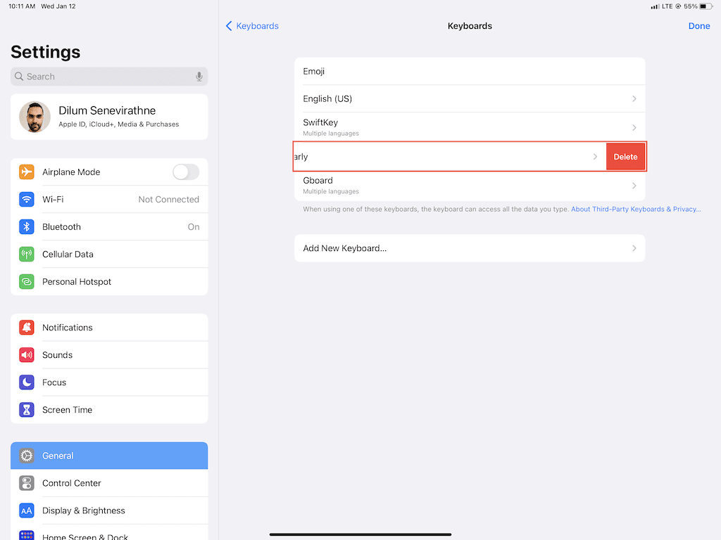 Si un teclado en pantalla de un tercero provoca fallas u otros problemas, intente actualizarlo a través de la App Store . Si eso no ayuda, dirígete a Configuración(Settings) > General > Teclado(Keyboard) > Teclados(Keyboards) . Luego, deslice el teclado hacia la izquierda y toque Eliminar(Delete) para desactivarlo.