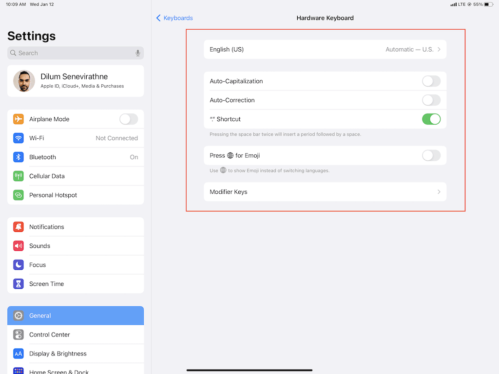 Si las teclas o funciones específicas no funcionan en su teclado externo, asegúrese de ir a General > Teclado(Keyboard) > Teclado de hardware(Hardware Keyboard ) para revisar y modificar la forma en que funciona.