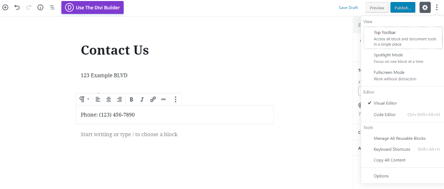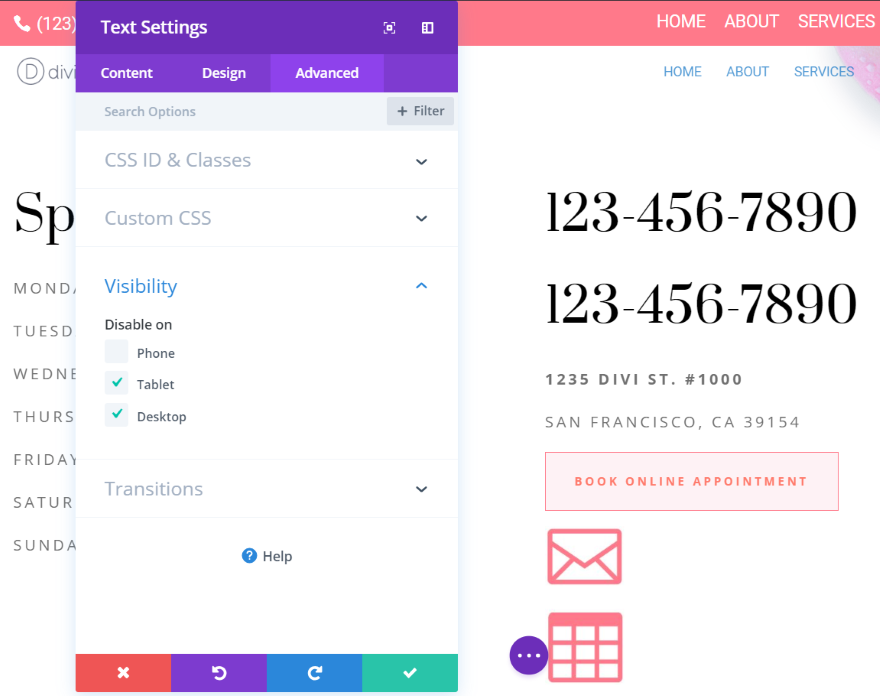 El número etiquetado> Mostrar un mensaje en lugar de un número se vería así: Sus invitados verán el texto, pero cuando hagan clic en él, verán su pantalla de marcación con su número listo para hacer clic en el botón de llamada. Algunos números de teléfono tienen la extensión. Puede agregar un código que cree una breve pausa antes de marcar el número de extensión. Suma PAGS. agregará una pausa de un segundo antes de expandirse. El código podría verse así: Esto marca el número, espera un segundo y luego marca el número de extensión. Puede esperar un tono de marcación usando en en cambio pags. Códigos de países se puede agregar uniendo + con código de país delante del número de teléfono. Un ejemplo podría verse así: Una de mis comodidades favoritas para llevar un teléfono inteligente es que busco un negocio local y el resultado de Google me da un número de teléfono en el que se puede hacer clic. Puedo hacer clic en un número para llamar sin tener que escribirlo o tratar de recordarlo. Esta característica es imprescindible ahora. Afortunadamente, puede agregarlo a su sitio web para que Google pueda proporcionar su número de teléfono en las búsquedas locales. Esto se hace usando microdatos. Los microdatos le dicen a los motores de búsqueda que los números son números de teléfono, por lo que aparecen como un enlace a una llamada en la que se puede hacer clic. Puede crear esto enriqueciendo la etiqueta con algunas etiquetas de búsqueda locales. Por ejemplo, el código podría verse así: Con HTML5, no está limitado a números de teléfono. Puede agregar otras llamadas a la acción, como correo electrónico, mensaje, fax, etc. Los protocolos HTML5 incluyen: Todos estos protocolos se utilizan de la misma manera que vimos anteriormente. Veamos algunos ejemplos. Uno de los mejores lugares para agregar un enlace a una conversación es la información de contacto en la página Contacto. Ya sea que esté utilizando el editor clásico o el nuevo editor de Gutenberg, deberá ver la versión de texto de la página. En el editor clásico, haga clic en Texto Correa. En Gutenberg, haga clic en tres puntos en la esquina superior derecha y seleccione editor de código. Agregue el código en lugar de su número de teléfono. Salga del editor de código o de la vista previa de la página y verá que su número de teléfono ahora es un enlace en el que se puede hacer clic. El código HTML para el correo electrónico es mailto: La dirección de correo electrónico se agrega al final de la siguiente manera: Al igual que con un enlace telefónico, puede usar la parte visual para agregar un mensaje como: Aquí hay un ejemplo de la página de contacto del paquete de diseño de Spa. Agregué un módulo de notas con un ícono y el texto Enviar correo electrónico. Elegí la pestaña Texto y agregué el código HTML del correo electrónico. Ahora se puede hacer clic en el texto y se abrirá su aplicación de correo electrónico. Puede tener código HTML para abrir cualquier url. Esto es bueno si desea enviar lectores a sus páginas para suscribirse a boletines, eventos, etc. Para vincularlos, su código HTML contendrá una URL. Por ejemplo: Agregué otra nota de código para ver la página de eventos. Uno de los problemas con la vinculación de enlaces es que no son útiles en computadoras de escritorio o tabletas. Puedes resolver este problema con Divi creando módulos específicos para cada tipo de dispositivo y luego deshabilitándolos en otros dispositivos. Aquí creé dos módulos con un número de teléfono: uno contiene el número de teléfono HTML y el otro no. Deshabilité el que tiene el número en el que se puede hacer clic en tabletas y computadoras de escritorio para que nunca vean el enlace. También deshabilité el módulo sin enlace para teléfonos, por lo que los usuarios de teléfonos solo verán el módulo de enlace. Puede agregar código al encabezado o pie de página usando el editor de temas. Utilice siempre un tema secundario, de lo contrario, el código PHP se sobrescribirá al actualizar el tema. Esto requerirá algunos estilos CSS para que se vea bien. En el panel, vaya a Apariencia> Editor> Cabecera de tema (o Tema Pie de página). Pon el código en la parte del código.<a href="tel:123-456-7890">CLICK TO CALL</a>