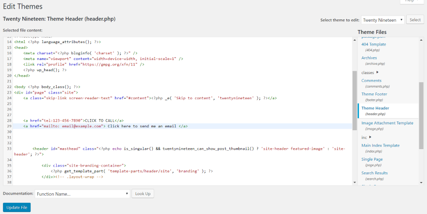 Así es como se ve cuando pongo un enlace a una llamada telefónica y un enlace a un correo electrónico en el encabezado del tema Twenty Nineteen. Lo es y funciona, pero no es muy bonito. Puede solucionar esto agregando espacio de color y márgenes para mantenerlos separados entre sí. Por supuesto, esto se hace en CSS.