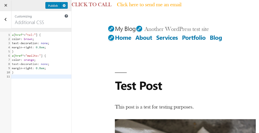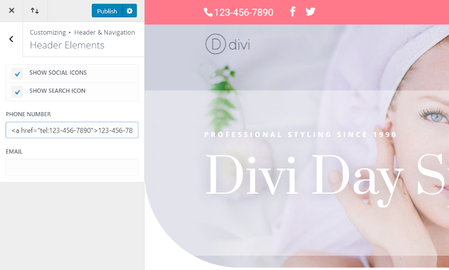 ir Personalizar temas > Título y navegación > elementos de encabezado. Esto le dará un cuadro de texto donde puede agregar su número de teléfono. Afortunadamente, no solo estás limitado a los números. También puede agregar código HTML. Agregué el código HTML de los ejemplos anteriores. También aumenté el tamaño de letra del número de teléfono para que sea más fácil ver las imágenes.