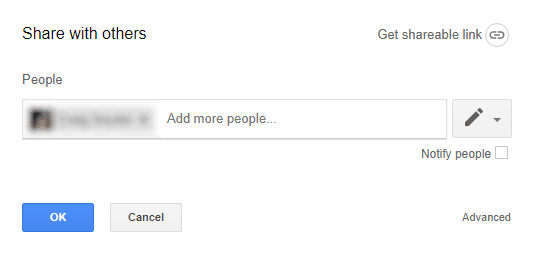 presiona el botón Aceptar(ESTÁ BIEN) para enviar la(s) invitación(es) para compartir archivos cuando esté lista. Después de eso, querrá volver a abrir el mismo archivo y hacer clic en el botón azul nuevamente. Para compartir(Comparar) o haga clic derecho en el archivo y haga clic en Para compartir(Comparar) . Haga clic esta vez Avanzado(Avanzado) en la esquina inferior derecha del cuadro iluminado.
