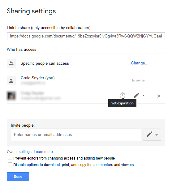En este caso, si pasa el cursor sobre la línea de cualquier usuario con el que está compartiendo el archivo, aparecerá un ícono de temporizador con las palabras » establecer un vencimiento(Establecer una caducidad) «Cuando pasas el cursor sobre él. Si no ve este ícono, es posible que no esté usando su cuenta en G suite compatible. Si es así, haga clic en él.