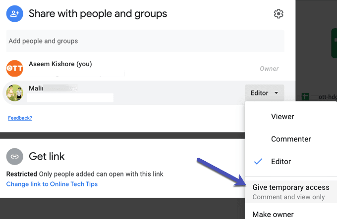 Otra razón por la que es posible que no lo veas es porque Google actualizado la interfaz interfaz gráfica de usuario por Google Drive . En su lugar, es posible que deba hacer clic en el pequeño menú desplegable junto a su nombre y luego hacer clic en Dar acceso temporal(Otorgar acceso temporal) .
