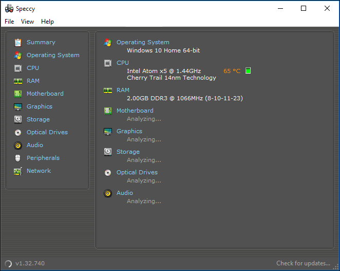 cuando abro especificidad por primera vez, comenzará a recopilar información sobre su computadora de inmediato. Puede verlo mirando la placa base, los gráficos, el almacenamiento, las unidades ópticas(unidades ópticas) y sonido.