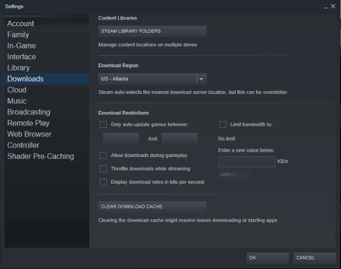 Otwórz Steam, a następnie kliknij Parowy > Ustawienie(Ustawienia) > pliki do pobrania(Pobieranie) i kliknij Wyczyść pamięć podręczną pobierania. (Wyczyść pamięć podręczną pobierania.)Może to potrwać kilka minut, po czym Parowy będzie musiał zostać ponownie uruchomiony. Ten krok może poprawić wiele błędów Parowy nie tylko ten.