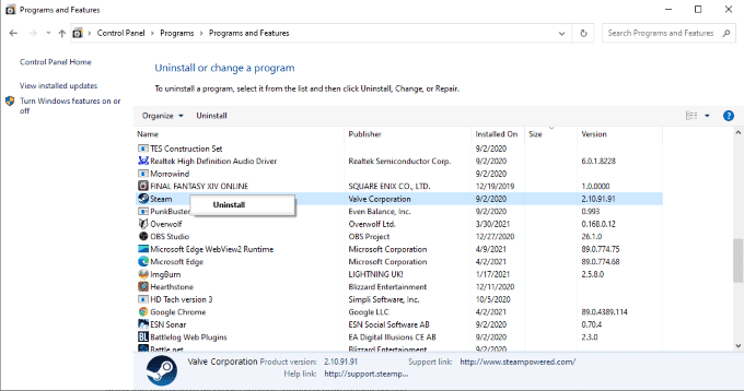 Jeśli wszystko inne zawiedzie, możesz całkowicie usunąć Parowy z komputera i zainstaluj go ponownie. usuwać Parowy otwarty Płyta(Panel sterowania) kontrola > Odinstaluj program( Odinstaluj program ) i kliknij prawym przyciskiem na Steam. wybierać Odinstaluj. (Odinstaluj.)Po usunięciu Parowy Uruchom ponownie komputer przed ponownym zainstalowaniem. mieć(niedźwiedź) Pamiętaj, że zrobienie tego spowoduje usunięcie wszystko(wszystko) Zawartość Steam, w tym pobrane gry(w tym pobrane gry) .