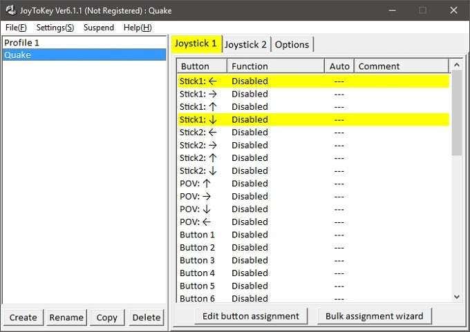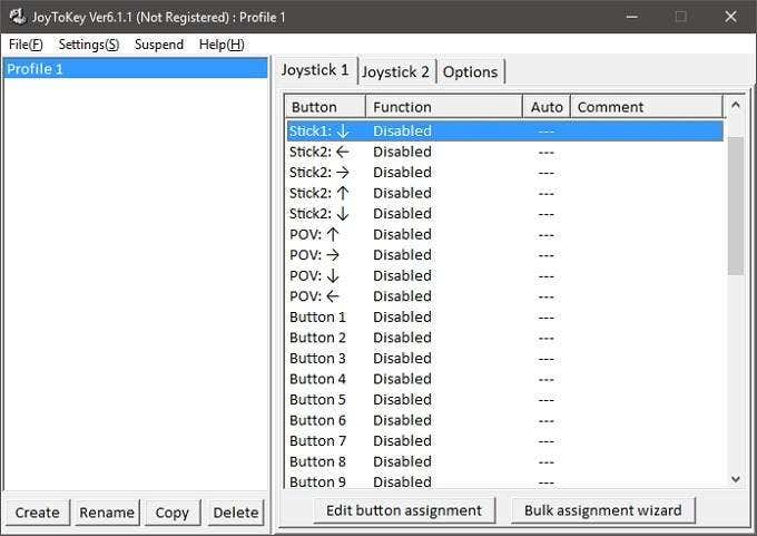 Ahora seleccione un perfil haciendo clic en él. Verá en el panel derecho que hay dos «pestañas de joystick». Como solo tenemos un gamepad conectado, solo usaremos palo 1 . En este panel, verá una lista de entradas en botones(Botones) .